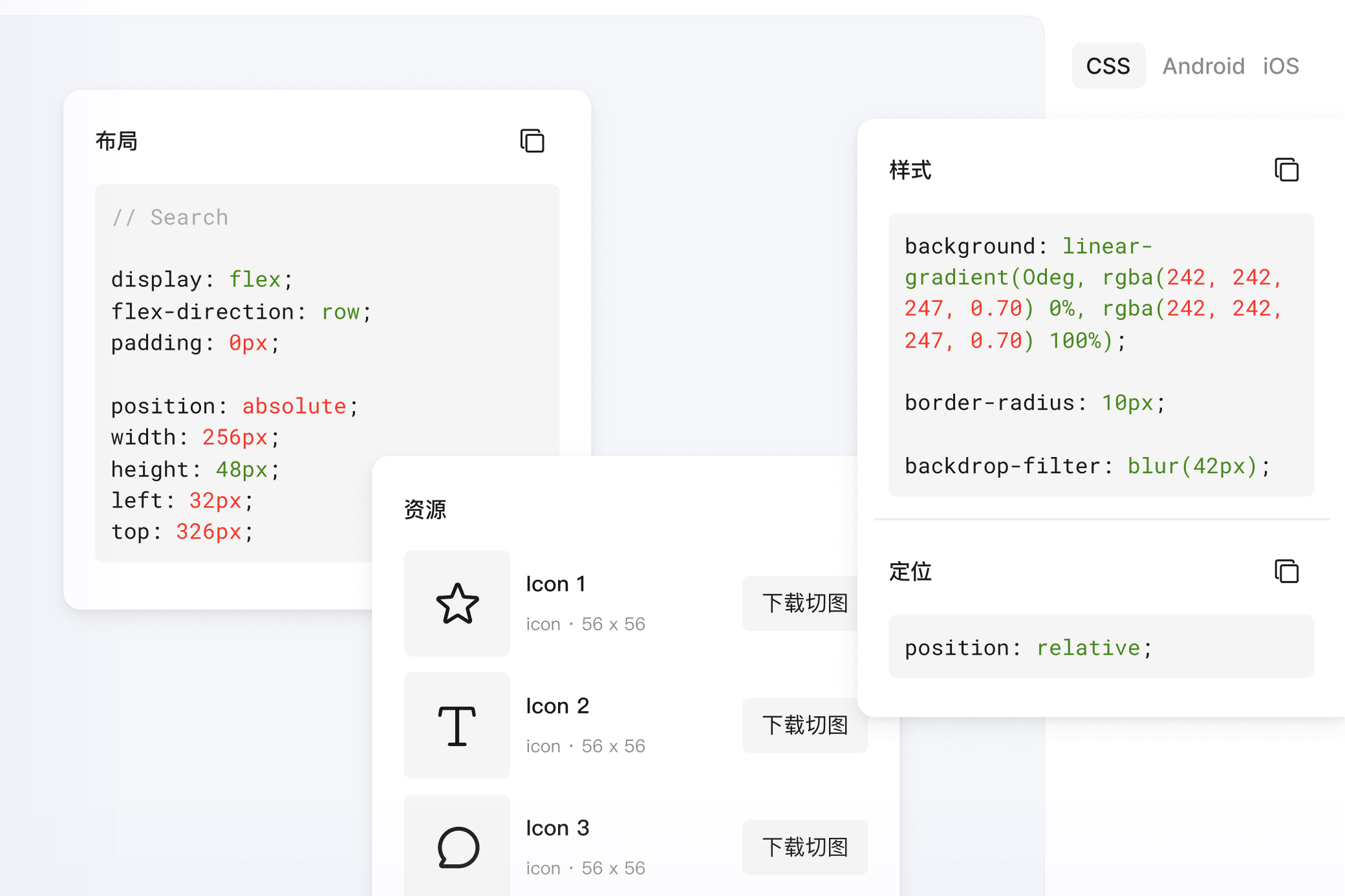 涵盖常见代码类型(CSS、iOS、Android),无需额外调整即可直接使用提供的代码